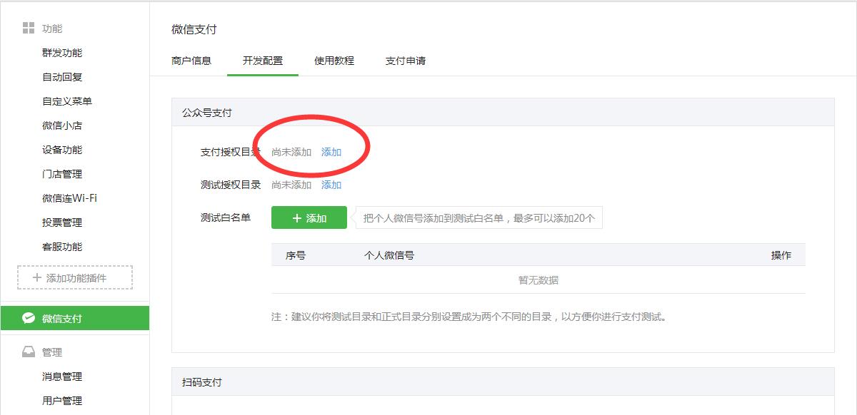 1、登录微信公众号平台,点击左边导航中微信支付>开发者配置>点击添加支付授权目录。