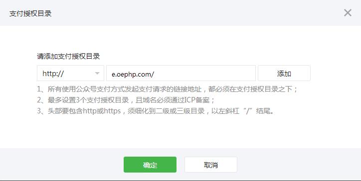 2、填写微信支付授权目录,格式如下;点击添加,再点击确认。